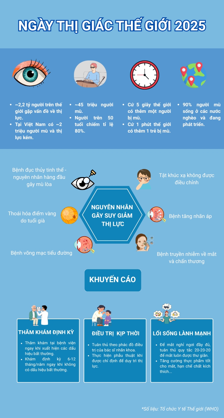 Nhân Ngày Thị giác Thế giới, hãy cùng nhìn lại thực trạng sức khỏe đôi mắt và trang bị cho mình những kiến thức cần thiết để bảo vệ “cửa sổ tâm hồn”. Infographics dưới đây sẽ giúp bạn hiểu rõ hơn về các bệnh lý thị giác phổ biến cũng như những biện pháp chăm sóc mắt hiệu quả để duy trì tầm nhìn sáng khỏe mỗi ngày.