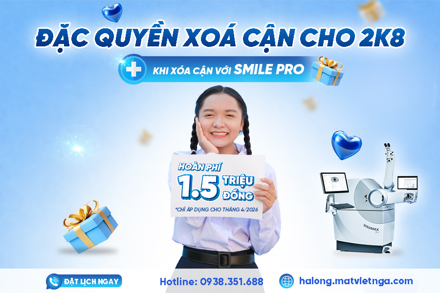 👉 Với mong muốn đồng hành cùng 2K8 trong giai đoạn quan trọng này, Mắt Việt – Nga Hạ Long triển khai chương trình ưu đãi đặc biệt: “Đặc quyền 2008 – Xóa cận hoàn phí”.